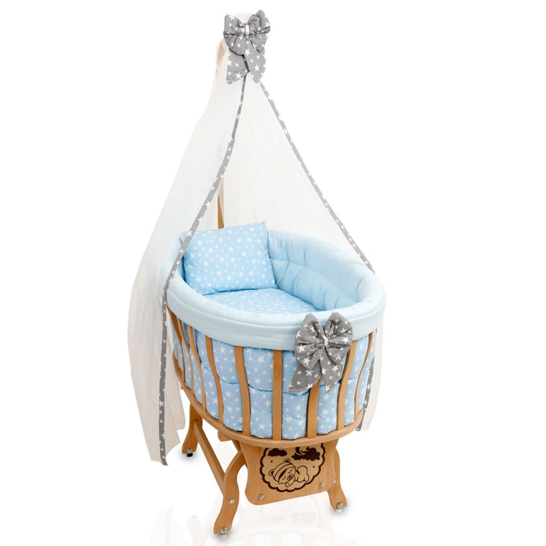 Beşiğimizin arka ayaklarında tekerlek ön ayaklarında sabitlenme pabuçları bulunmaktadır. Rahatlıkla odadan odaya taşınabilir.